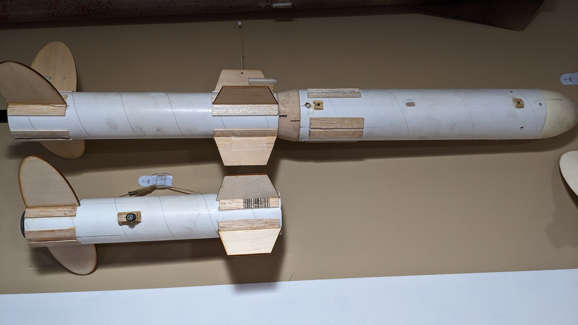 Our first several tests (to the surprise of several NAR members) flew straight up on the first flight, cementing the unconventional fin design on our rocket. However, we were way off on the target height set by the competition. After some modifications, our flights looked promising. That's when we had our first flight failure. We had used elastic for the shock chord, and the heat from the ejection charge had burned through it, causing a seperation of the motor body from the payload section. We couldn't get the rocket back to its original potential, and ended up not making the national fly-offs.